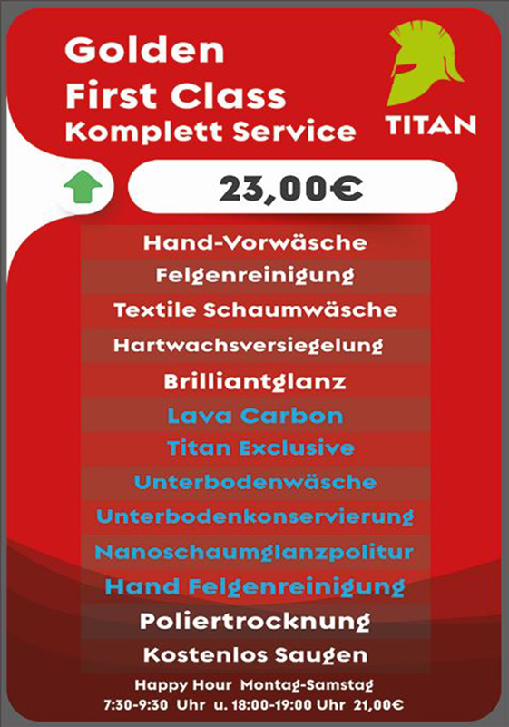 Bitte beachten Sie, dass das letzte Waschprogramm um 18:50 Uhr stattfindet bzw. einlaufen muss, da unser Waschpark um 19:00 Uhr schließt. D.h. die Waschstraßen-Annahme schließt bereits um 18:50 Uhr.